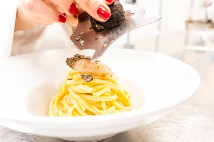 La dolcezza del gambero rosso si unisce all’aroma intenso del tartufo in un equilibrio di eleganza e carattere, per un piatto armonioso e dal profumo inconfondibile.