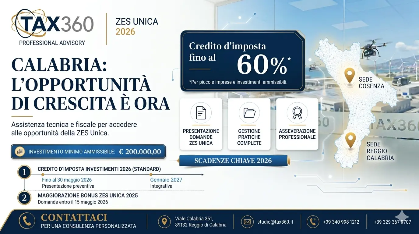 In un momento storico cruciale, la ZES Unica rappresenta lo strumento più efficace per gli imprenditori del Sud che intendono investire, innovare e far crescere la propria quota di mercato. Lo studio TAX360 accompagna le imprese in ogni fase: dalla pianificazione dell'investimento alla gestione tecnica del credito, trasformando un'agevolazione fiscale in un reale vantaggio competitivo.