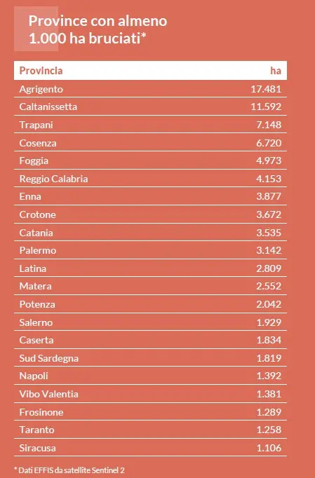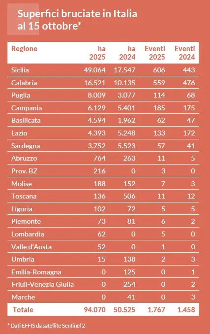 Il 2025 è un anno da bollino rosso per le foreste italiane, messe sotto scacco dall’impennata degli incendi e dall’accelerata della crisi climatica. I dati raccolti da Legambiente nel suo nuovo report, e presentati oggi a Roma all’VIII Forum Foreste, restituiscono un quadro poco felice: nella Penisola, incrociando i dati EFFIS da satellite Sentinel 2 che tengono conto anche degli incendi sotto gli 30 ettari, da inizio anno al 15 ottobre sono bruciati ben 94.070 ettari di territorio, pari a 132 mila campi da calcio, quasi il doppio rispetto agli ettari andati in fumo nel 2024 ossia 50.525 ha. Il Sud Italia si conferma l’area più colpita dalle fiamme: maglia nera alla Sicilia, con 49.064 ettari bruciati in 606 incendi; seguita da Calabria, con 16.521 ettari in 559 eventi, Puglia con 8.009 ettari in 114 eventi, Campania con 6.129 ettari in 185 eventi, Basilicata con 4.594 ettari in 62 eventi. Ci sono poi il Lazio con 4.393 ettari in 133 eventi e Sardegna con 3.752 ettari in 57 eventi. A livello provinciale, le province più colpite, sono quelle siciliane di Agrigento (17.481 ha brucati), Caltanissetta (11.592 ha), Trapani (7.148 ha), seguite da Cosenza (6.720 ha) e Foggia (4.9739 ha). All’impennata degli incendi, si affianca l’accelerata della crisi climatica che contribuisce a rendere le foreste più fragili e vulnerabili con eventi meteo estremi sempre più intensi, ondate di siccità, e un’estate 2025 che per l’Italia, secondo Copernicus, è stata la quinta più caldaregistrata dal 1950 ed è stata segnata da un’anomalia termica di +1,62°C. Preoccupa anche la proliferazione del bostrico, un piccolo coleottero che negli ultimi anni è uno dei principali responsabili dei gravi danni alle foreste alpine già devastate dalla tempesta Vaia e causando il disseccamento e la morte di moltiabeti rossi. Ingenti anche i danni economici. In Trentino, ad esempio, i danni attribuibili al bostrico nel periodo 2019-1°giugno 2024 sono ammontati a circa 2,7 milioni di metri cubi di legname(Fonte Provincia di Trento). L’altro alert è che l’Italia sta così perdendo, a causa di incendi, crisi climatica e insetti parassiti, dei preziosi alleati nella mitigazione dei cambiamenti climatici essendo le foreste pozzi naturali di assorbimento e stoccaggio di anidride carbonica (CO2). Quelle italiane riescono ad accumulare ben 1,24 Gt miliardi di tonnellate di carbonio organico, ma per adempiere a questa funzione devono rimanere efficienti e in buona salute.