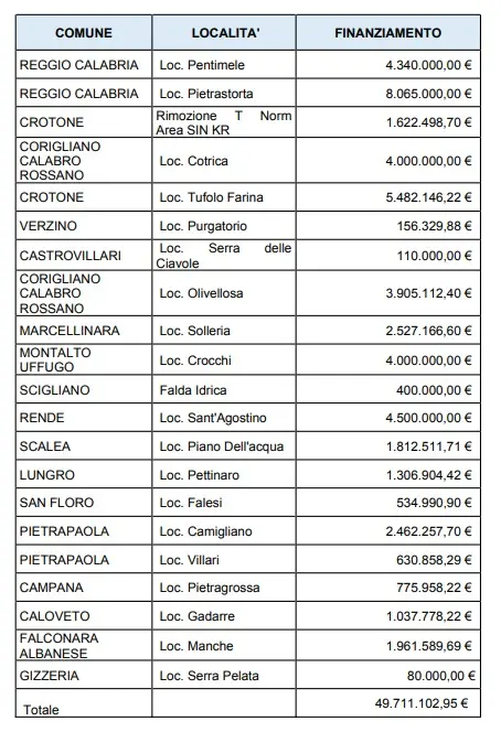 Il decreto approva il quadro finanziario e autorizza l’impegno pluriennale di 49.711.102,95 euro, destinati alla realizzazione di 21 interventi di bonifica in altrettanti Comuni calabresi. Le opere prevedono messa in sicurezza, recupero e riqualificazione di ex discariche o aree fortemente compromesse, contribuendo alla tutela ambientale e alla rigenerazione territoriale. Il finanziamento è interamente a carico del Fondo per lo Sviluppo e la Coesione (FSC), ripartito negli esercizi 2025-2031, garantendo così continuità programmatoria e copertura economica completa.