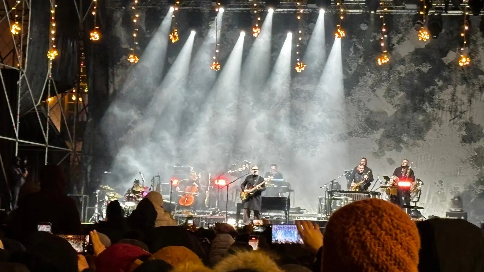 Parte quindi Canzone contro la paura, uno dei momenti più intensi del concerto, accolto da un lungo applauso. La piazza ascolta, canta, partecipa. Il live si costruisce come un dialogo continuo tra palco e pubblico, capace di reggere il freddo e di trasformarlo quasi in dettaglio marginale.