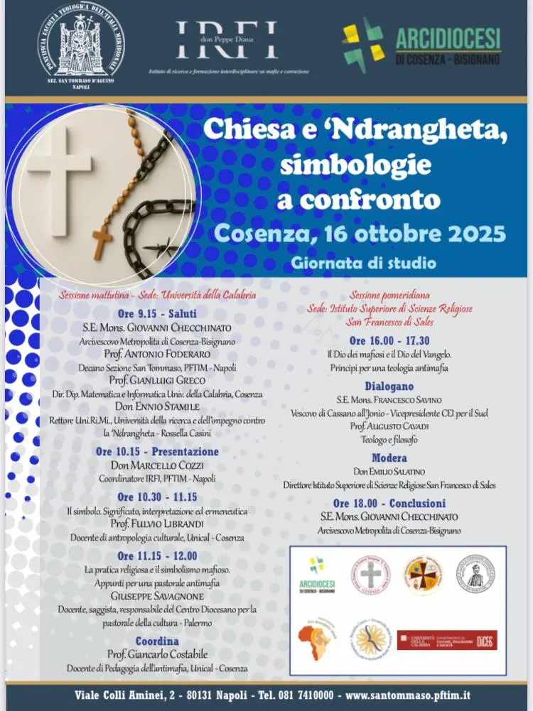 L’Istituto di Ricerca e Formazione Interdisciplinare sulle mafie – don Peppe Diana, attivo presso la sezione San Tommaso della Facoltà Teologica dell’Italia Meridionale di Napoli, promuove per domani (giovedì 16 ottobre), una importante Giornata di studi sul tema “Chiesa e ’Ndrangheta, simbologie a confronto” che si terrà a Cosenza in due sessioni: la mattina (9.15) presso la Sala University Club, Cubo 23/C dell’Università della Calabria e il pomeriggio (16.00) presso la Sala conferenze dell’Istituto Superiore di Scienze Religiose “San Francesco di Sales” a Rende. L’evento è organizzato in collaborazione con l’Arcidiocesi di Cosenza-Bisignano, il Dipartimento di Culture, Educazione e Società dell’Università di Calabria, l’Istituto Superiore di Scienze Religiose di Cosenza, l’Istituto Teologico Calabro di Catanzaro, la Scuola di Formazione Teologica della Diocesi di S. Marco Argentano, l’Uni.Ri.Mi. – Rossella Casini e l’Associazione San Benedetto di Cetraro (Cs).