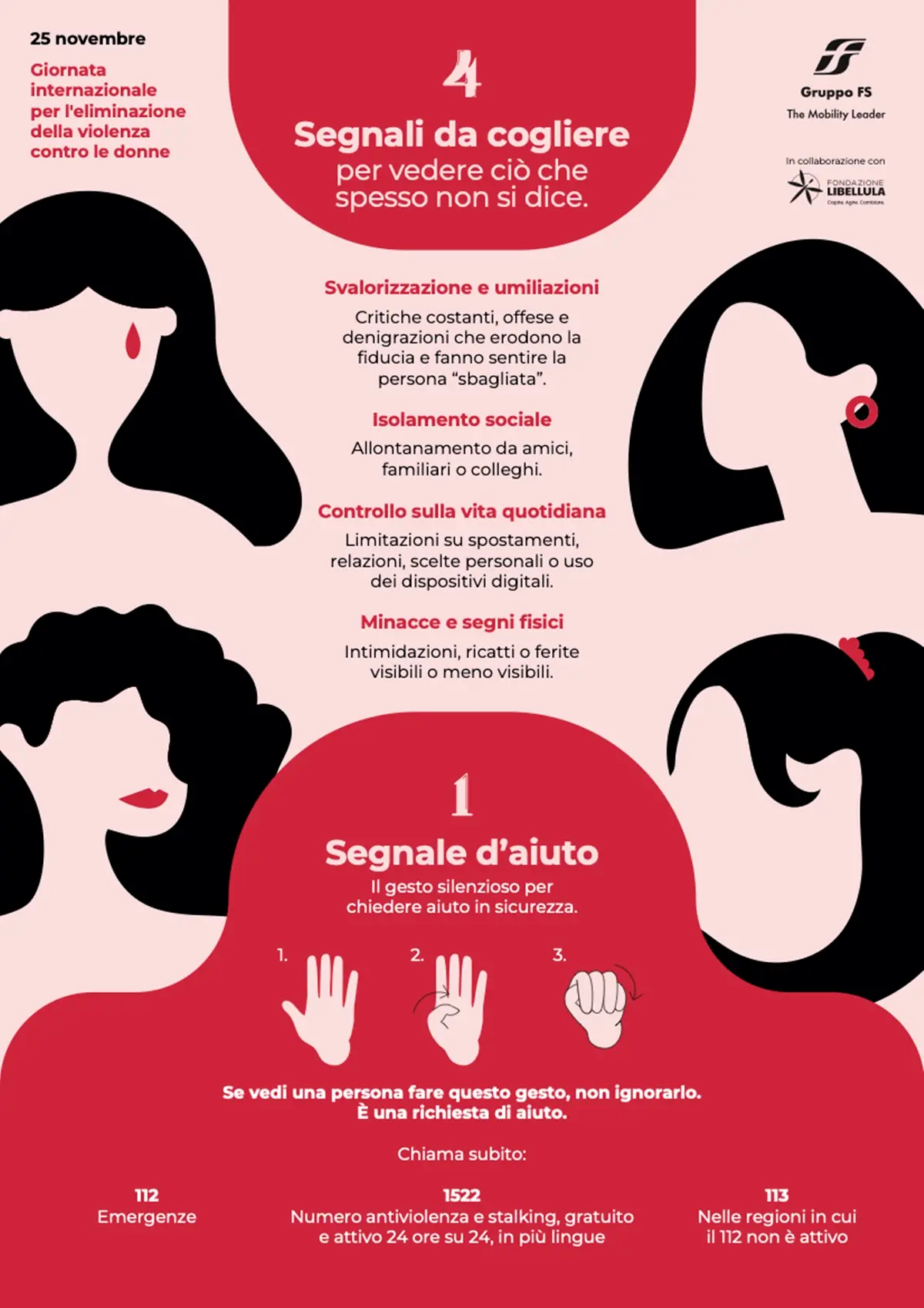 Il Gruppo FS, in collaborazione con Fondazione Libellula, ha anche creato una guida con l’obiettivo di accrescere la consapevolezza sulle diverse forme di violenza (psicologica, economica, fisica e sessuale, stalking e cyberviolenza) per contribuire a riconoscerle, specie quando sono silenziose e sembrano innocue.