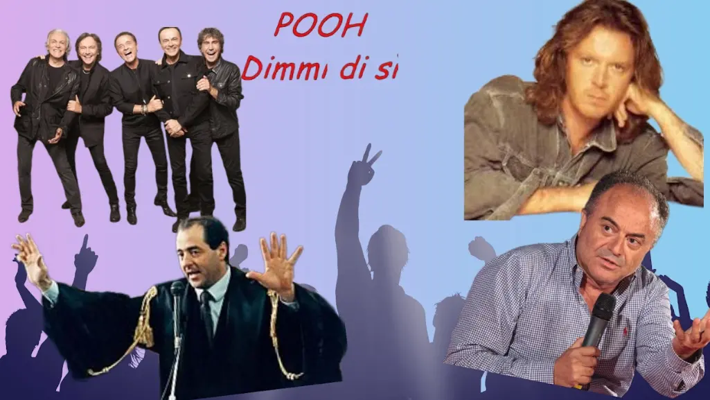 Sul versante del consenso riformatore si ode, dunque, il richiamo quasi cavalleresco del brano "Dimmi di sì". In questa canzone dei Pooh — modulata con la consueta eleganza melodica e con quella particolare solennità sentimentale che ha reso celebre la band — il “sì” assume la forma di un invito delicato ma fermo, di una proposta di fiducia reciproca, quasi di un patto affettivo tra chi domanda e chi è chiamato a rispondere. Trasposto nel linguaggio della politica, quel “sì” diviene metafora di un atto di fiducia verso il mutamento istituzionale: una riforma che promette di rimodulare gli equilibri della giustizia senza intaccarne la dignità. A cantarla è un esponente sostenitore del sì: Antonio Di Pietro. Sì, proprio lui. Quello di Mani pulite. Di Pietro canta: "non ti dirò che è stato subito amore, che senza te non riesco neanche a dormire". Lo fa solennemente, sapendo che non è stato subito amore con i suoi alleati sostenitori del sì, talvolta, più che amore è stato odio.