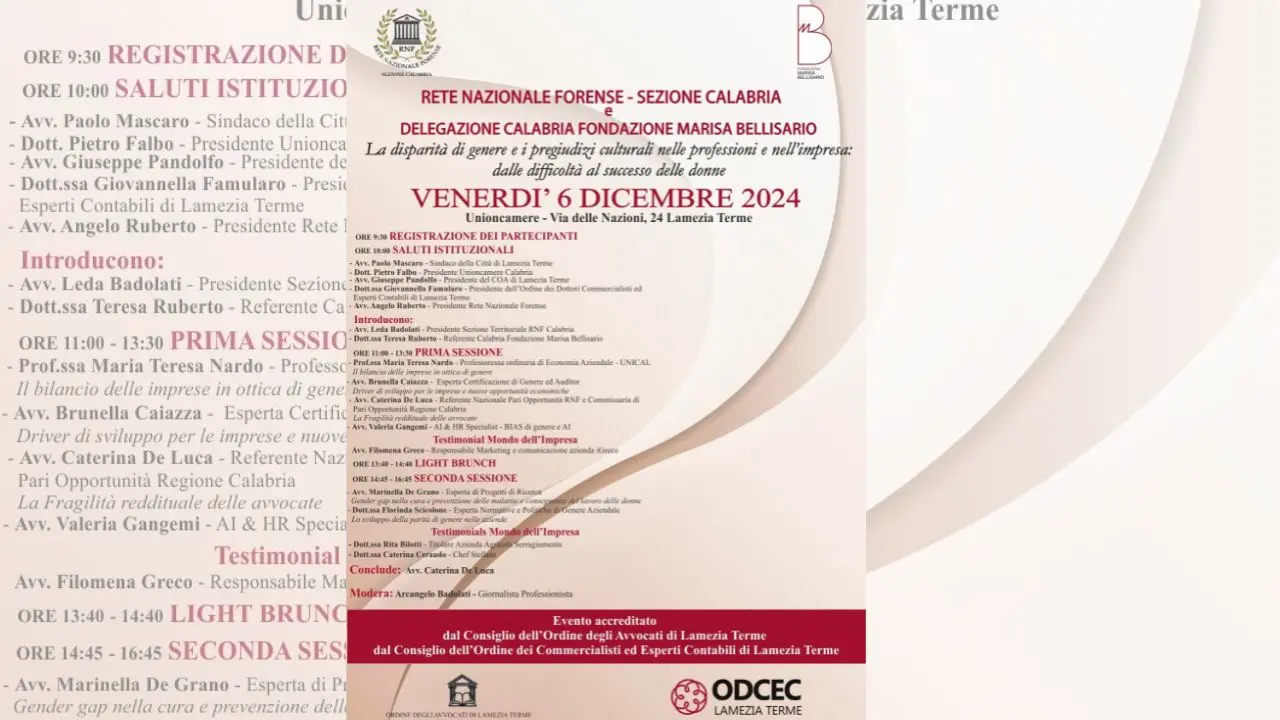 La Sezione Territoriale Calabria di Rete Nazionale Forense, il Dipartimento Nazionale delle Pari Opportunità di Rete Nazionale Forense e la Fondazione Marisa Bellisario-Regione Calabria, sono gli organizzatori di un evento di carattere giuridico e formativo, previsto per il prossimo 6 dicembre, presso la sede di Unioncamere Calabria, a Lamezia Terme.