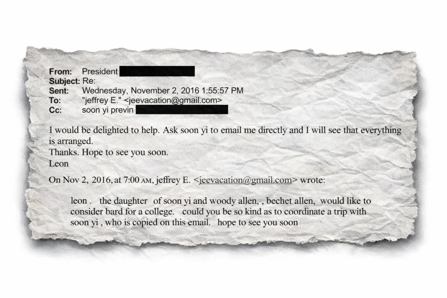 C’è la faccenda delle baby squillo, c’è la faccenda delle violenze sulle minorenni, c’è l’eugenetica, ci sono i dialoghi disturbanti con personaggi influenti che amavano parlare con lui di scienza e razza (da Chomsky a Bill Gates) o gli chiedevano un favore (Soon-Yi Previn, la moglie di Woody Allen in una delle tante email lo ringrazia per aver fatto entrare la figlia Bechet Allen al Bard College, prestigiosa università nello Stato di New York diretta dall’amico di Epstein, Leon Botstein); c’è la faccenda dei soldi che passavano dalle sue mani e poi sparivano, c’è la faccenda dei ricatti, della politica, degli intrecci con il governo sionista e quello russo e americano. C’è un do ut des continuo tra Epstein e chiunque bussasse alla sua porta.