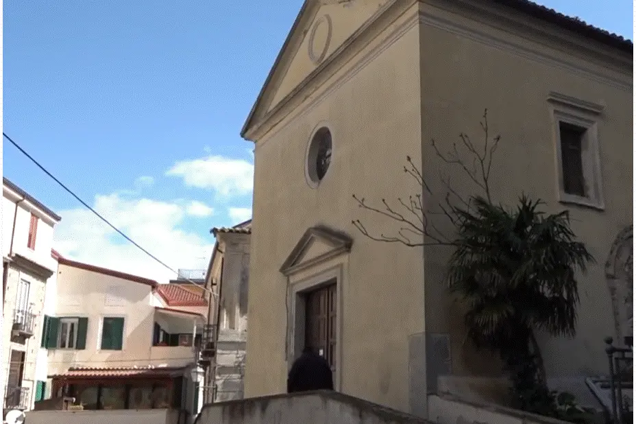 Dentro la chiesa c'è una persona che parla e c'è un dialogo tra i sacerdoti fuori.