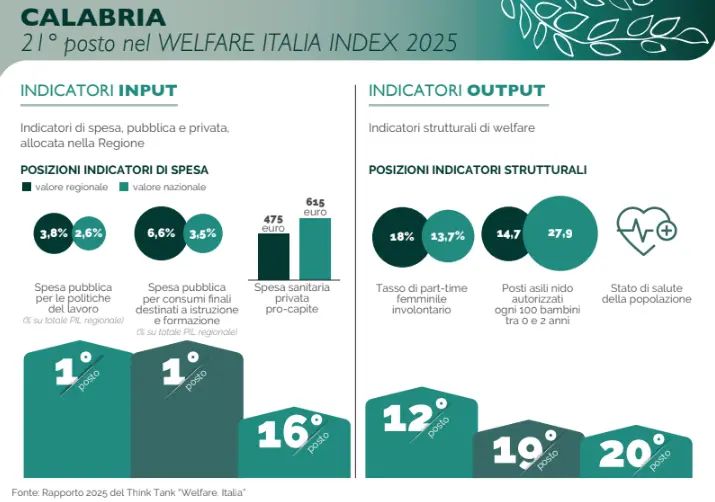 Con un punteggio di 60,2 (in una scala da 0 a 100), la Calabria si posiziona al 21° posto tra le Regioni italiane per efficacia e capacità di risposta del sistema di welfare.