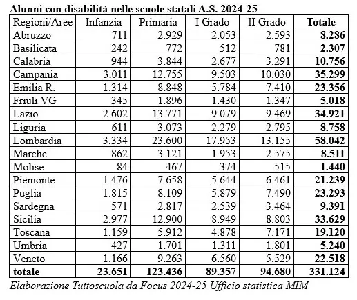 Si tratta di circa 225mila alunni certificati secondo L.104/92 in più rispetto al 2000, quando erano solo 125.308: uno ogni 60 alunni. Gli alunni con disabilità sono dunque ormai il 5% della popolazione scolastica, praticamente uno ogni 20 alunni nelle scuole statali (circa uno in ogni classe). Il maggior numero di alunni con disabilità si trova nelle scuole primarie (oltre 123mila) seguito dalla secondaria di II grado. È la Lombardia ad avere i numeri più importanti: accoglie oltre 58mila alunni con disabilità nelle proprie scuole. In Calabria gli alunni con disabilità sono in tutto 10.756. Di seguito tutti dati.