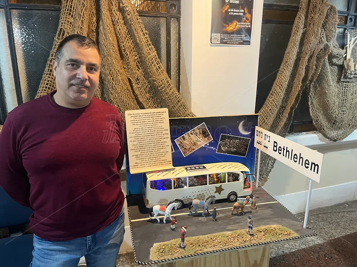 «Ho voluto rappresentare la nascita di Cristo in un giocattolo per bambini, per tutti noi il futuro del mondo. Ma si tratta di un giocattolo rotto perchè questo futuro è a rischio. Ho lavorato con il sughero e con il legno per creare la Natività all'interno dei questo pullman giocattolo, partito in direzione Betlemme e che però poi si è fermato in centro strada, in avaria. La stessa avaria in cui sembra trovarsi il mondo segnato da guerre e stragi, frutto della sete di denaro e di potere. E quindi è un mondo che và allo sfascio e il pullman che, dovrebbe rappresentare il futuro, si ferma al centro strada con le quattro frecce accese», spiega Nino Sgrò, anche lui socio della sede Don Matteo Plutino di Reggio Calabria dell'Associazione Italiana Amici del Presepio.