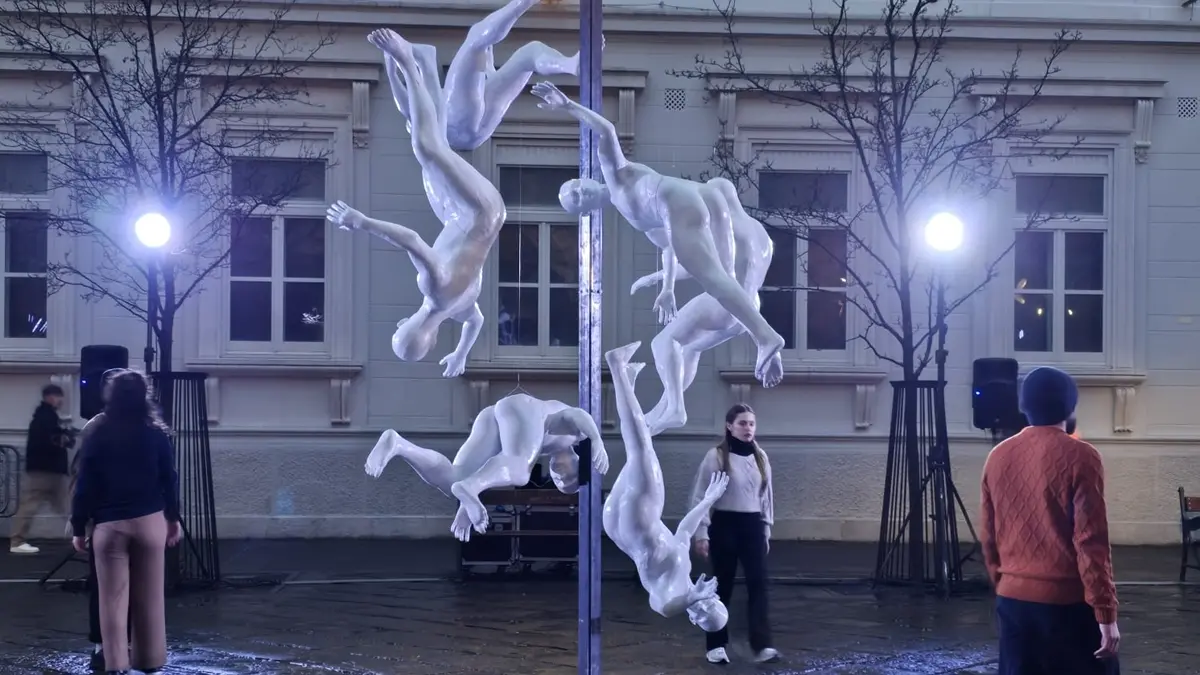Al centro dell’azione vi sono esclusivamente i corpi sospesi in posture irregolari e drammatiche, alcuni inclinati, altri orizzontali, altri ancora capovolti. Non vi è un gesto unitario né una composizione ordinata: ciascun corpo sembra perdere progressivamente il controllo del proprio peso, come se fosse stato improvvisamente sottratto a ogni riferimento.