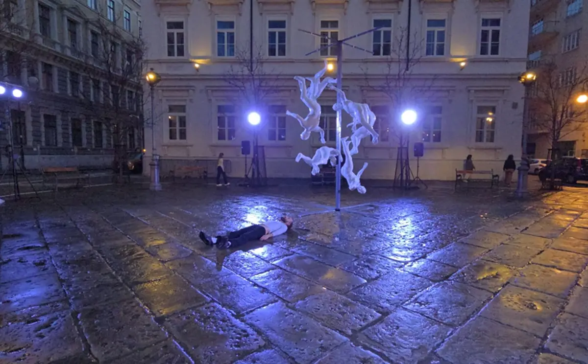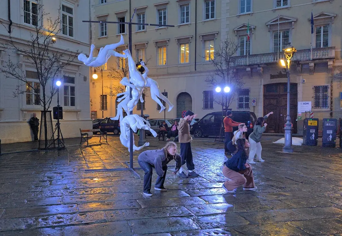 L’intervento artistico e performativo a Trieste si è proposto come una riflessione visiva e corporea sulla perdita, sulla violenza e sulla sospensione della vita, ispirata alle tragiche vicende delle Foibe.