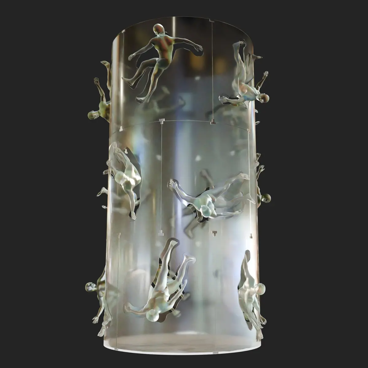 Un cilindro monumentale del diametro di circa 3 metri e un’altezza di 6 metri, costruito mediante lastre in plexiglas trasparente, delimiterà lo spazio verticale, ne definirà l’impianto scultoreo e – sottolinea ancora il professore di Tecniche della Scultura, Luigi Citerrella – si proporrà di rendere l'opera più drammatica possibile. Esso simbolicamente rappresenta la foiba, intesa come abisso fisico e morale in cui i corpi sono sospesi in una caduta perpetua, fissati in una dimensione fuori dal tempo, a evocare il tragico e irreversibile destino delle vittime.