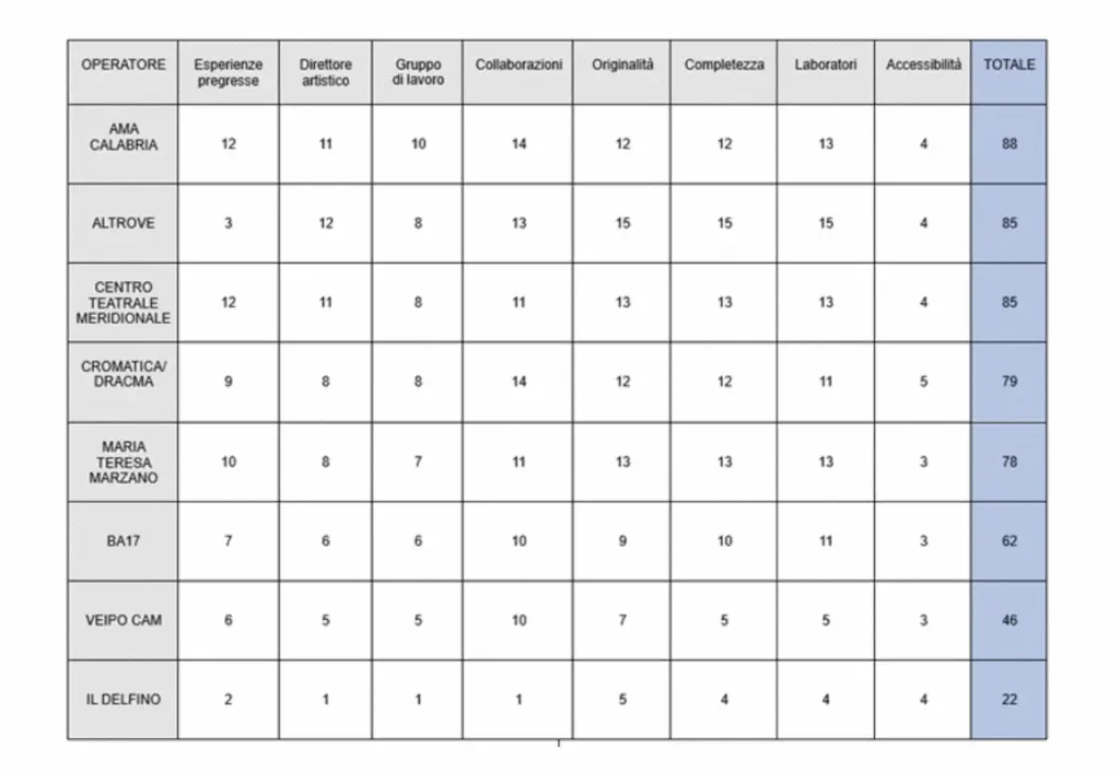 «Il primo punto della tabella valutativa di cui all’avviso di manifestazione di interesse valuta le esperienze pregresse dell’ente, nella gestione di teatri e/o sale multifunzionali e/o realizzazione di programmazioni, rassegne o festival a carattere annuale. Valutazione necessaria - si rileva - ma che, a nostro avviso, è svolta in maniera non efficace ai fini della selezione di un’ottima stagione per il pubblico. Operando nella sfera dell’organizzazione di spettacolo, è endemico costituire non solo enti ad hoc per la singola selezione ma ingaggiare diverse professionalità esterne all’ente per la realizzazione del progetto che spesso (come in questo caso) presenta particolari sfide tecniche ed organizzative. Ne consegue che l’ente di per sé, in casi come questo, è solamente un contenitore che, come nel caso di una costituzione ad hoc, non possiede un curriculum valutabile ma team e proposta validi. Ci preme specificare che l’attività di AMA Calabria sarà sicuramente efficace ma l’avviso non premia la proposta e lo fa, potenzialmente, a spese del pubblico. Valutazione dunque formalmente legittima ma miope».