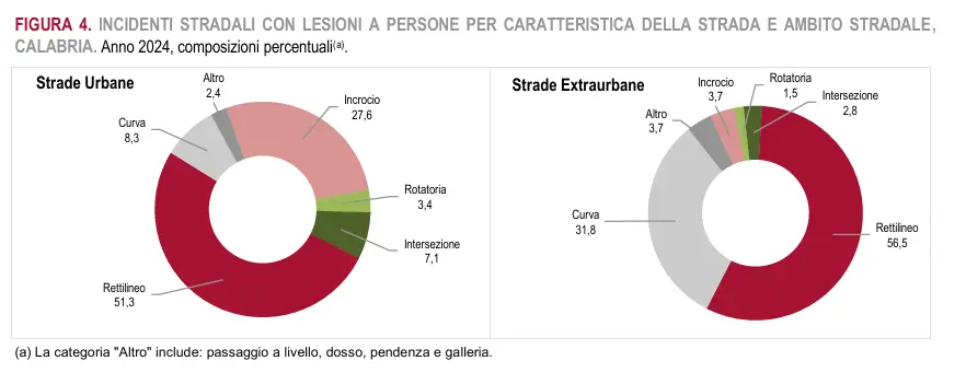 Nel confronto con il 2023, gli incidenti aumentano su tutte le tipologie di strada, ma l’incremento maggiore si osserva sulle autostrade (+21,6%). In ambito urbano, oltre la metà dei sinistri avviene lungo tratti rettilinei, mentre incroci e curve rappresentano altri punti critici. Sulle strade extraurbane, invece, le curve concentrano quasi un terzo degli incidenti.