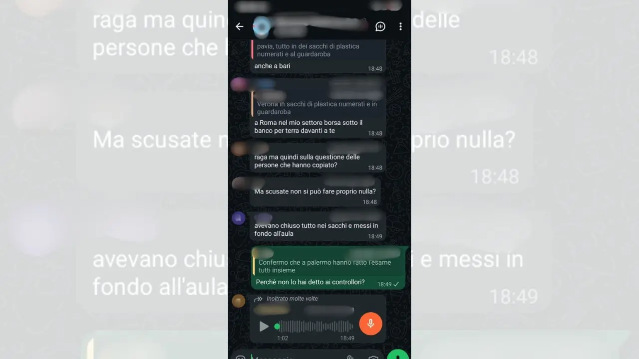 Alcuni screenshot, inviati da una studentessa dell’Unical che preferisce rimanere anonima e tratti da un gruppo WhatsApp frequentato da studenti di tutta Italia, riportano testimonianze e segnalazioni provenienti da diverse città. A Brescia qualcuno avrebbe segnalato anomalie senza ricevere alcun intervento, a Roma si parlerebbe addirittura di risposte giunte in anticipo, mentre a Palermo un telefono sarebbe squillato in aula senza che la prova venisse annullata, nonostante il divieto assoluto di introdurre cellulari. E questi sarebbero solo alcuni degli episodi discussi online.