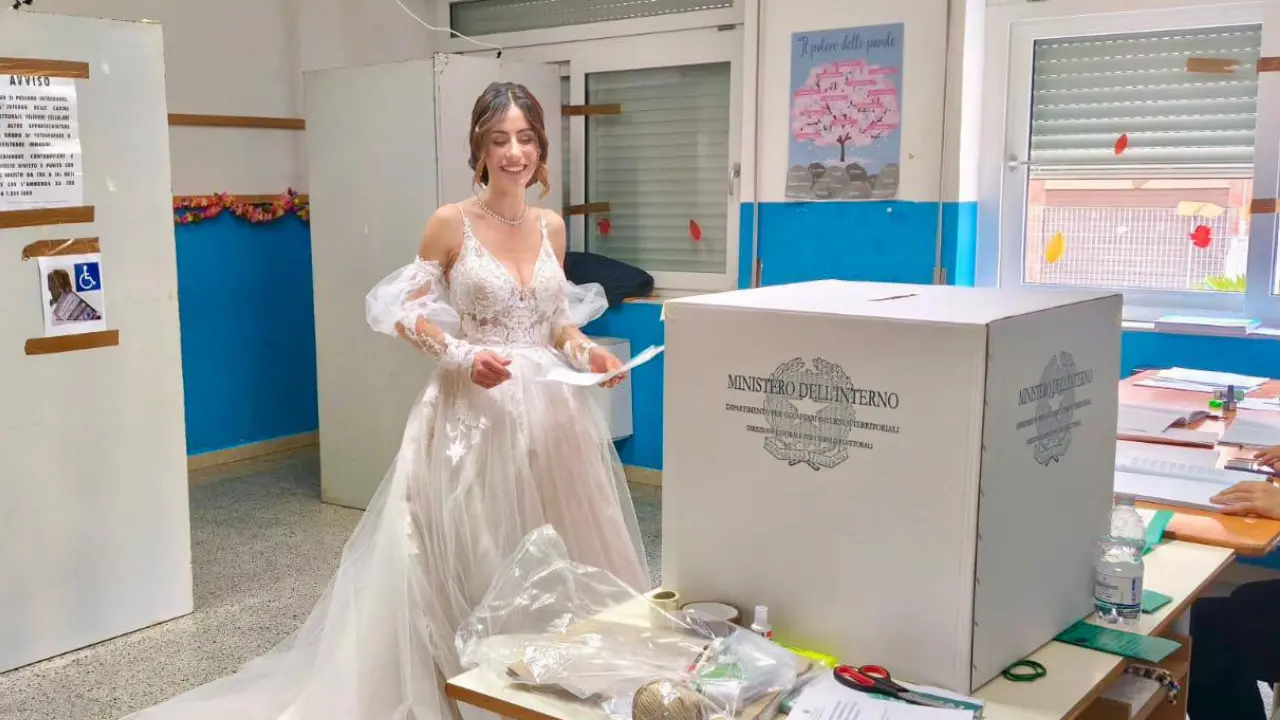 Una scena insolita ma carica di significato quella avvenuta a San Gregorio d’Ippona durante le elezioni regionali in Calabria. Una coppia di novelli sposi si è presentata al seggio elettorale subito dopo la cerimonia nuziale, ancora vestiti con gli abiti del grande giorno. Le immagini, che mostrano la sposa in elegante abito bianco mentre inserisce la scheda nell’urna, hanno fatto rapidamente il giro dei social, suscitando curiosità e ammirazione.