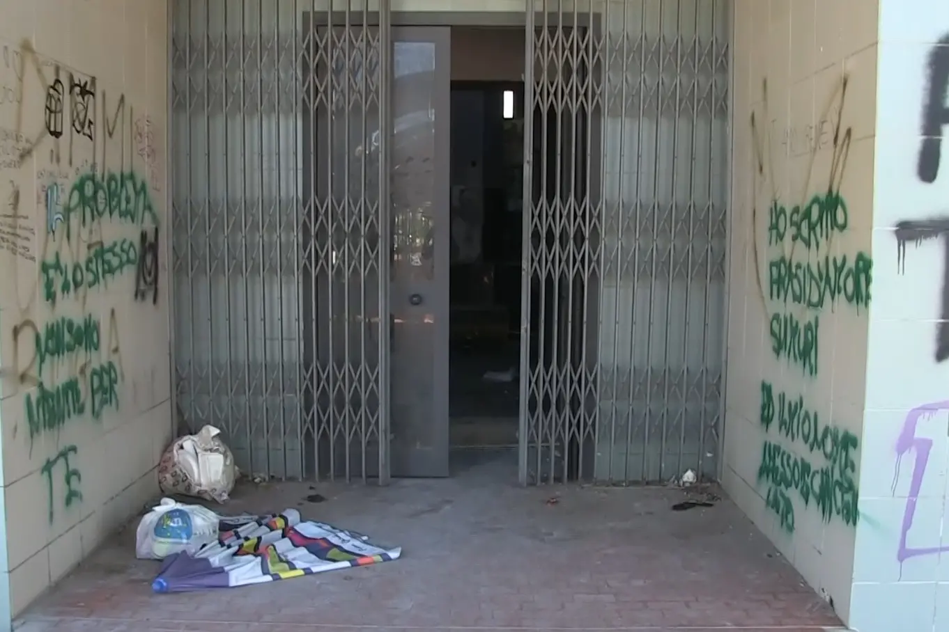 Il vetro che proteggeva il quadro elettrico è stato infranto. Come infranti sono i vetri della biglietteria. Faldoni di documenti delle Ferrovie della Calabria giacciono aperti e sparsi, alla mercé di chiunque. Il soffitto è ricoperto di muffa e annerito in alcuni punti: chi è entrato qui ha persino dato fuoco ad alcune attrezzature in legno. Ci sono segni di bruciature anche sugli ombrelloni.