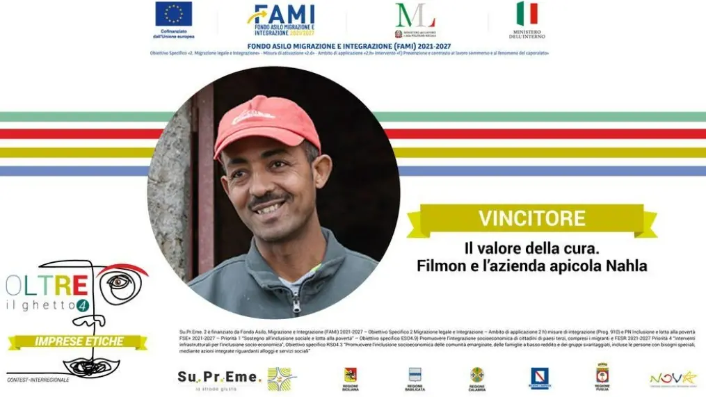 Con il 42,4% dei voti totali, il video-reportage “Il valore della cura. Filmon e l’azienda apicola Nahla” è risultato vincitore del contest “Oltre il ghetto”, sezione “Imprese etiche”, nell’ambito del programma Su.Pr.Eme., finanziato dall’Unione europea, per il contrasto alle emergenze legate allo sfruttamento lavorativo e al caporalato.