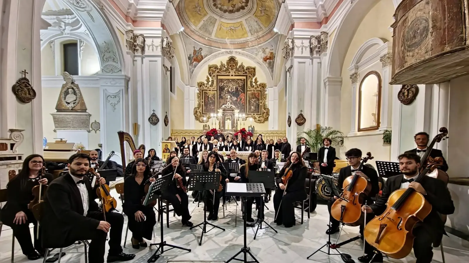 Protagonisti della serata sono stati il Coro Polifonico Santa Maria di Porto Salvo di Siderno, diretto e preparato da Salvatore Trifiletti, e la Leonard Bernstein Chamber Orchestra, guidata dal suo direttore musicale e artistico, il Maestro Francesco Menniti. La direzione di Menniti ha dato forma a un percorso sonoro coerente e meditato, in cui ogni brano sembrava dialogare non solo con il successivo, ma anche con lo spazio sacro che lo accoglieva e con il tempo liturgico che si andava a concludere. Il programma, ampio e articolato, ha condotto il pubblico in un viaggio che ha attraversato secoli e linguaggi musicali. Dalle melodie della tradizione natalizia, cariche di memoria collettiva, alle grandi pagine del melodramma ottocentesco, fino alle colonne sonore del Novecento e alle composizioni di ispirazione sacra contemporanea, la musica si è fatta racconto, riflessione, preghiera. Momenti di intensa suggestione sono stati offerti dai solisti: le voci del coro di Luisa Umbaca, Isidoro Galdino, Lucy Azzarelli e Salvatore Trifiletti, capaci di coniugare precisione tecnica ed espressività; il violino di Gianfrancesco Federico, protagonista di una pagina virtuosistica che ha acceso l’attenzione del pubblico; la chitarra di Andrea Lanzellotti, che ha portato in chiesa una dimensione intima e cinematografica; l’oboe di Renato Esposito, il cui timbro limpido ha saputo evocare un dialogo silenzioso tra umano e divino. Particolarmente significativa la presenza del soprano Rosanna Vono, giovane talento calabrese,