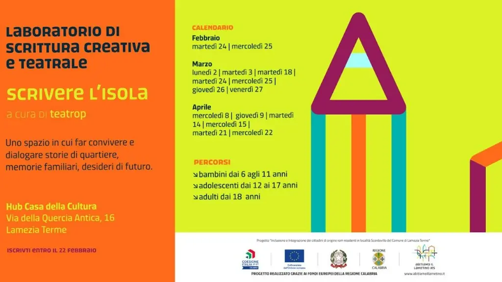 Entrano nel vivo le attività di Intrecci – Abitiamo il Lametino, il percorso che promuove percorsi di abitare condivisi e processi di partecipazione nel territorio lametino. Nell’ambito del progetto prende il via il laboratorio gratuito “Scrivere l’isola – laboratorio di scrittura creativa e teatrale” a cura di TeatroP, partner dell’Ats Abitiamo il Lametino, pensato come spazio di formazione, espressione e incontro per la comunità di Lamezia Terme nella sua pluralità di voci, esperienze e appartenenze.