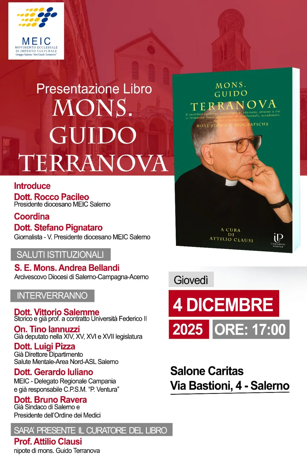 Sarà presentato domani a Salerno il volume curato da Attilio Clausi dedicato a Monsignor Guido Terranova, figura centrale della cultura cattolica del Novecento. Sacerdote calabrese originario di Joggi, frazione di Santa Caterina Albanese, Terranova divenne salernitano d’adozione dal 1945, anno in cui seguì l’arcivescovo Demetrio Moscato trasferendosi dalla Calabria alla città campana.
