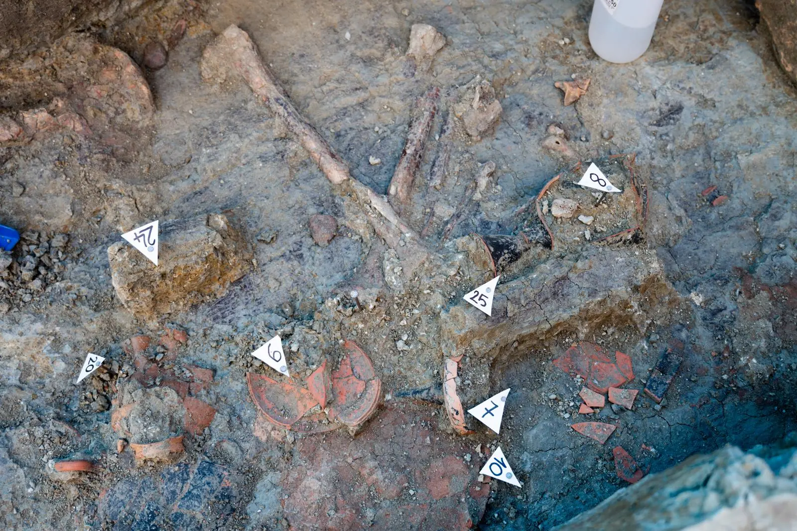 Nella nota, la Soprintendenza fornisce maggiori dettagli sul ritrovamento: «Nella sepoltura, praticata nel terreno e priva di copertura, erano stati deposti una donna di età adulta ed un bambino: ad accompagnare la defunta nel suo ultimo viaggio un corredo con diverse forme ceramiche decorate a figure rosse e alcuni monili in bronzo, elementi che consentono di datare la deposizione alla fine del IV secolo a.C.