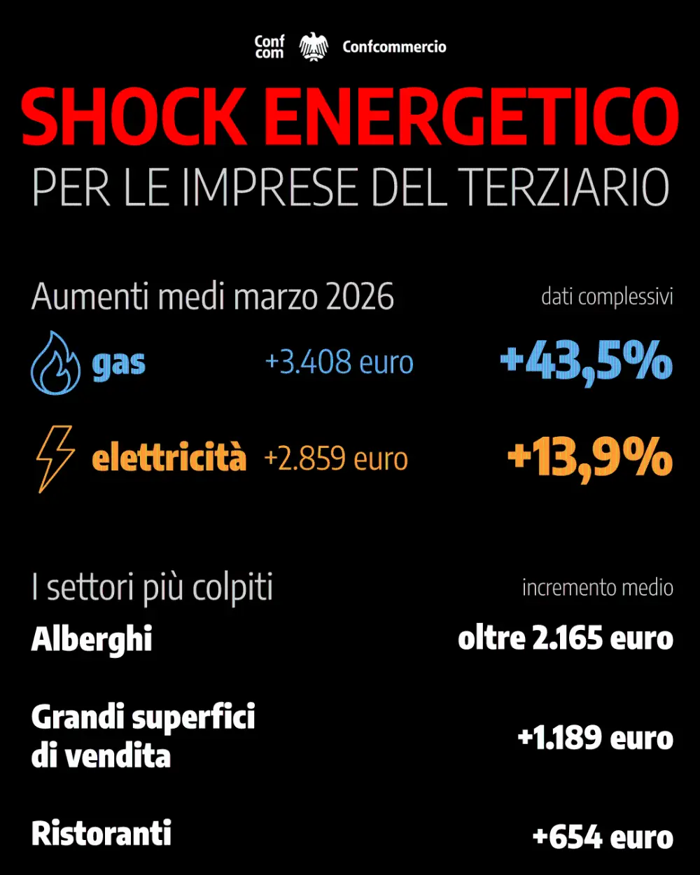 Le tensioni legate al conflitto in Iran stanno causando nuovi shock sui mercati energetici internazionali, con effetti diretti sulle bollette di elettricità e gas delle imprese italiane del terziario. L’impatto dipenderà dall’evoluzione della crisi. Secondo un’analisi di Confcommercio e Centro Europa Ricerche, in uno scenario di base in cui i prezzi restano stabili ai livelli dei primi giorni dopo lo scoppio del conflitto, a marzo 2026 le bollette elettriche potrebbero aumentare dell’8,5%, passando da 20.521 euro di media nel primo bimestre a 22.269 euro. In uno scenario peggiore, con conflitto prolungato, l’aumento potrebbe arrivare al 13,9% (23.380 euro), con un incremento medio per tutti i settori di circa 2.850 euro. Per il gas, gli aumenti sarebbero più marcati: +30% nello scenario base (da 7.833 euro a 10.181 euro) e +43,5% nello scenario peggiore, fino a 11.241 euro, +3.400 euro in media.