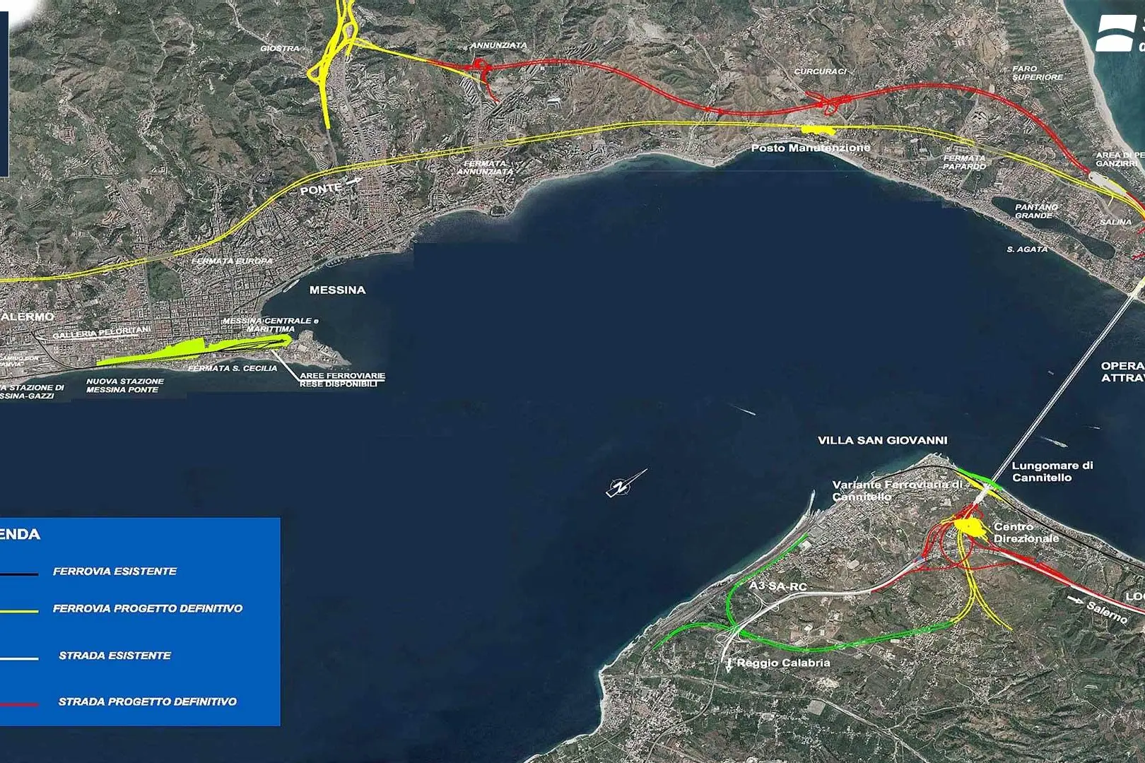 I cantieri, alla fine, non sono partiti. Accadrà, forse, nei prossimi mesi. Il Governo insiste sul progetto da 13,5 miliardi di euro affidato al consorzio internazionale Eurolink guidato da Webuild, con la giapponese IHI, il gruppo spagnolo Sacyr ed i progettisti dello studio danese Cowi. Al momento pareri controversi stoppano la realizzazione di un’opera che si annuncia la più imponente e costosa mai realizzata nel nostro Paese e che punta a modernizzare e velocizzare i collegamenti Nord-Sud. Per unire Sicilia e Calabria ci vorranno 8 anni e 36mila tra tecnici ed operai specializzati. Nell’indotto ci sarà lavoro per circa duemila imprese con un ulteriore impiego di circa 50mila unità. Secondo le stime il contributo al Pil sarà pari a 23 miliardi. I guadagni previsti per la Sicilia e per la Calabria ammontano complessivamente a 4 miliardi fino alla realizzazione dell’opera. Con i suoi 3.660 metri di lunghezza, 3.300 di campata unica, il Ponte avrà 3 corsie per direzione (due di marcia e una di emergenza) e una sede ferroviaria a doppio binario. Le torri saranno alte 399 metri, per una capacità massima di 6mila veicoli all'ora e 200 treni al giorno. Il progetto prevede una serie di interventi infrastrutturali su entrambi i versanti: 20 km di rete stradale e 20 km di rete ferroviaria a doppio binario e 3 nuove stazioni ferroviarie, un centro direzionale a Villa San Giovanni.