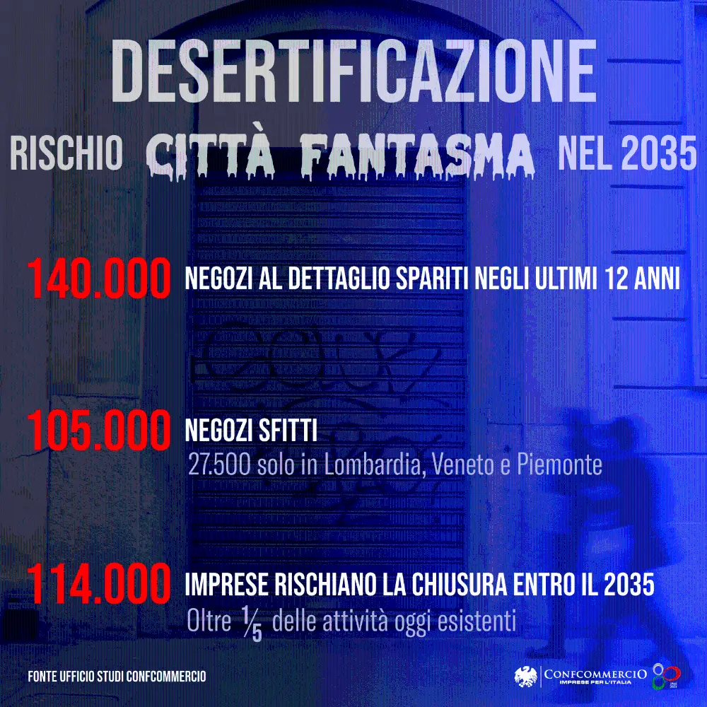 Meno incassi, più costi di gestione. Negli ultimi dodici anni più di 140mila esercizi commerciali al dettaglio hanno cessato l’attività. Nei prossimi dieci anni chiuderanno altri 111mila negozi. La crisi demografica e occupazionale, la riduzione dei consumi da parte delle famiglie, le città con costi della vita e con costi d’impresa insostenibili e lo spopolamento dei comuni aggravano una situazione che oggi è già al limite. Da Nord a Sud accade ovunque, ma ci sono aree del Paese in cui il fenomeno è destinato ad aggravarsi.