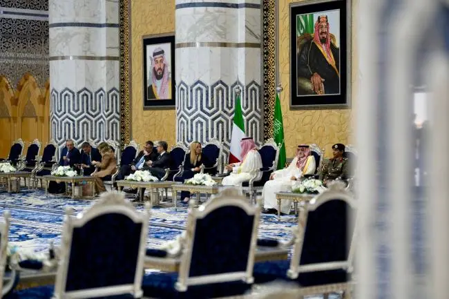 Con la sua presenza la presidente del Consiglio ha voluto esprimere il sostegno e la vicinanza dell’Italia ai paesi sotto attacco ritorsivo. Palazzo Chigi fa sapere che a Gedda, nel corso del colloquio con il principe ereditario e primo ministro saudita Mohammed bin Salman, i due capi di governo hanno discusso «dell’assistenza militare difensiva fornita dall’Italia, confrontandosi sulle prospettive del conflitto e sugli sforzi in corso per una soluzione diplomatica e, più ampiamente, su come promuovere un quadro regionale che possa uscire dall’attuale situazione di conflittualità». L’incontro ha anche «permesso di discutere di come assicurare gli approvvigionamenti energetici e ridurre l’impatto della crisi su imprese e cittadini». I due capi di governo hanno concordato sulla necessità di «assicurare al più presto la libertà di navigazione nello Stretto di Hormuz».