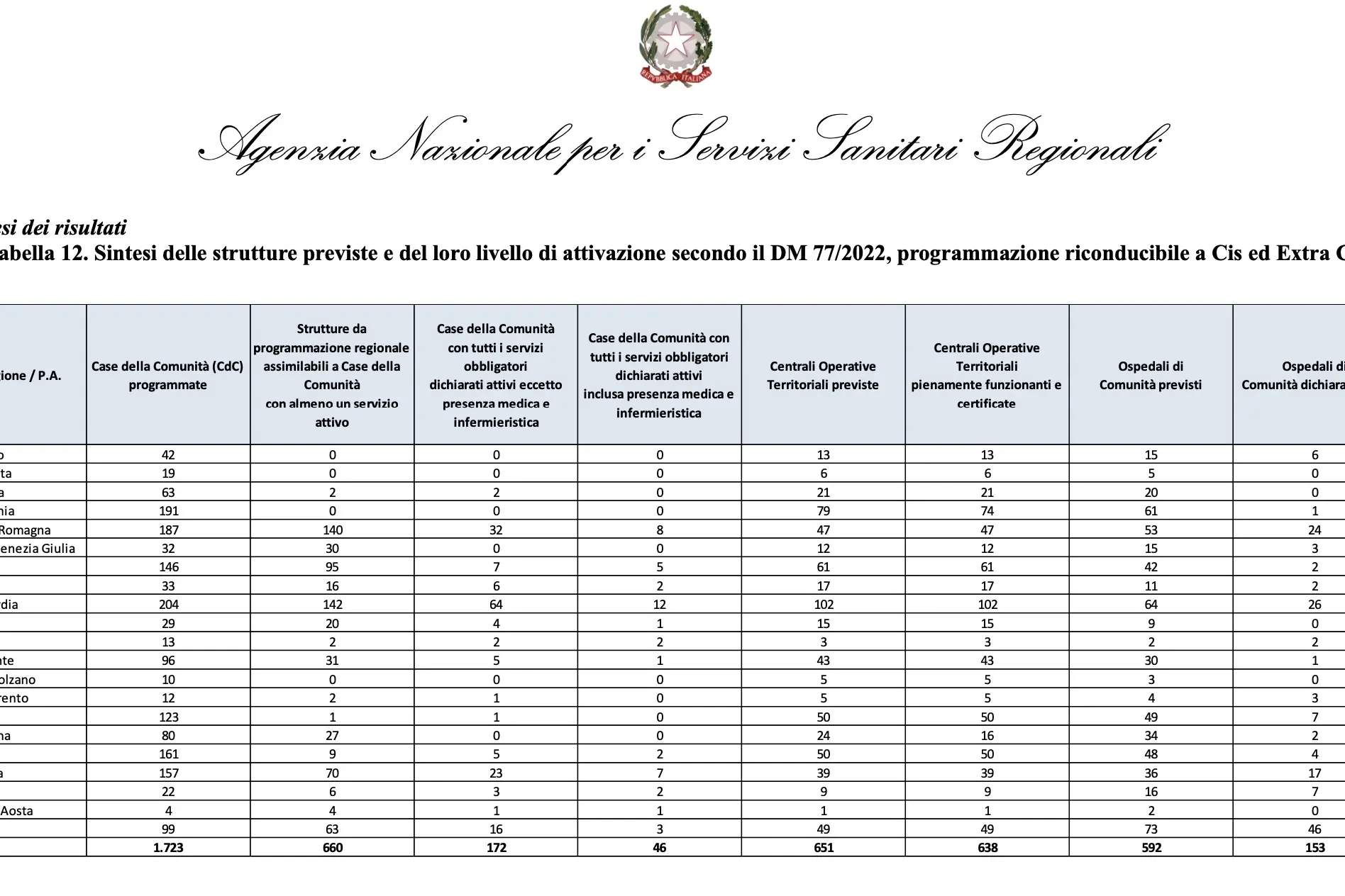 Dal monitoraggio dell’Agenas risultano aperte 660 delle 1.723 Case di comunità previste entro il 2026 ma solo 46 hanno tutti i servizi. Il maggior numero si trova in Lombardia, 142. Seguono l’ Emilia-Romagna con 140, il Lazio con 95, la Toscana con 70 ed il Veneto con 63. Il Sud, invece, è in grave ritardo con appena 41 centri aperti. L’Abruzzo, la Basilicata, la Campania e la Provincia di Bolzano sono a zero. Mancano medici ed infermieri. Solo in 172 delle 660 case di comunità aperte nei pronto soccorso è assicurata la presenza di almeno un medico nell'arco delle 12 ore di apertura previste e solo in 162 di queste c'è un ambulatorio infermieristico.