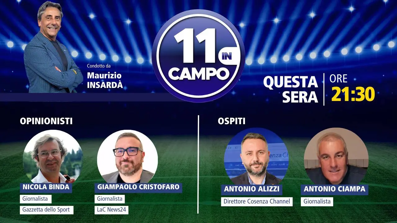 Andrà in onda questa sera alle 21. 30, su LaC Tv, la sedicesima puntata di “11 in campo”, il format sportivo condotto da Maurizio Insardà con la partecipazione di Nicola Binda. In studio il giornalista di LaC News 24 Giampaolo Cristofaro.