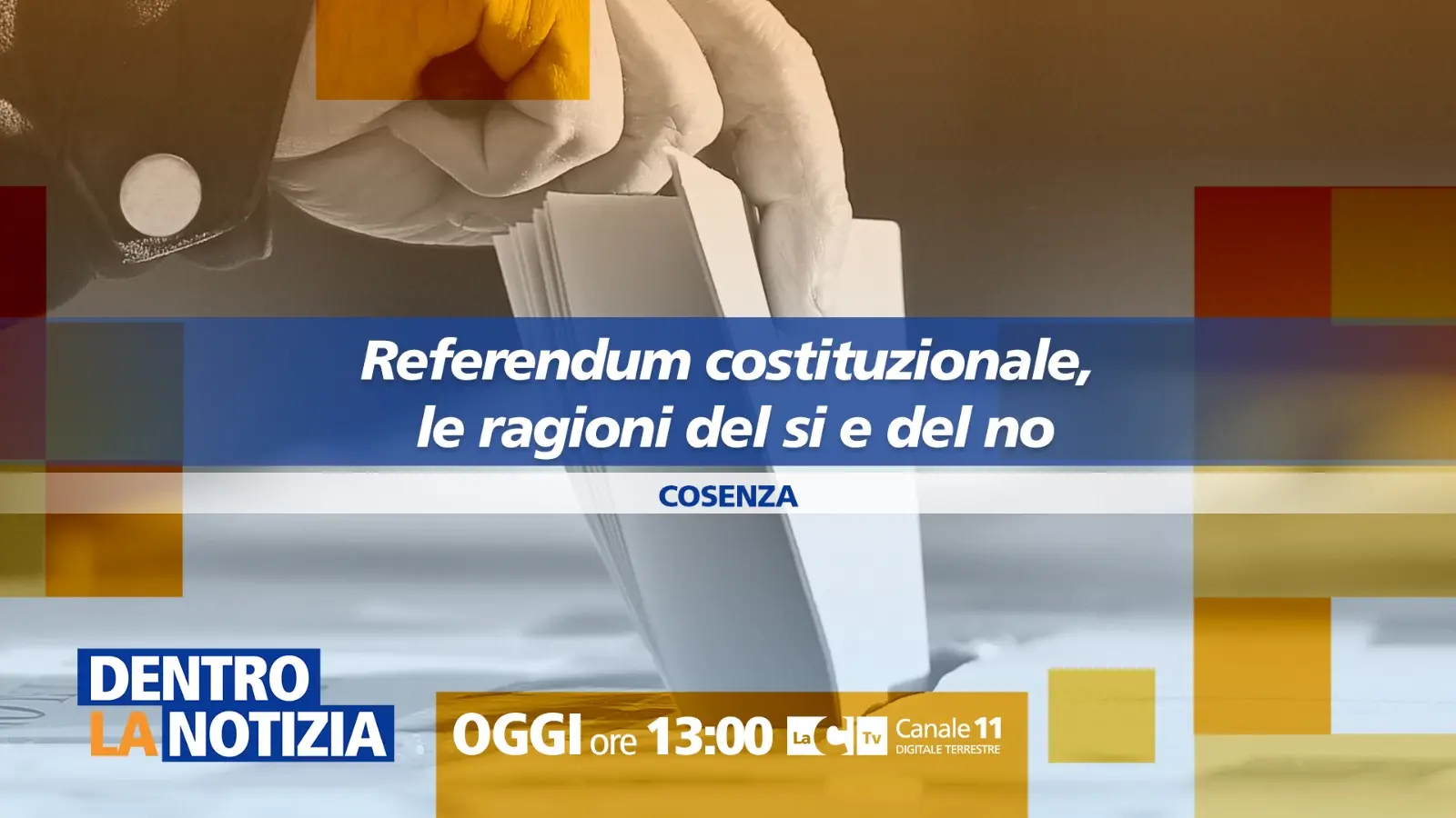 Nel corso della trasmissione illustreremo punto per punto tutte le modifiche alla Costituzione previste dal testo normativo adottato in doppia lettura dai due rami del Parlamento. Appuntamento alle 13 su LaC Tv, canale 11 del digitale terrestre