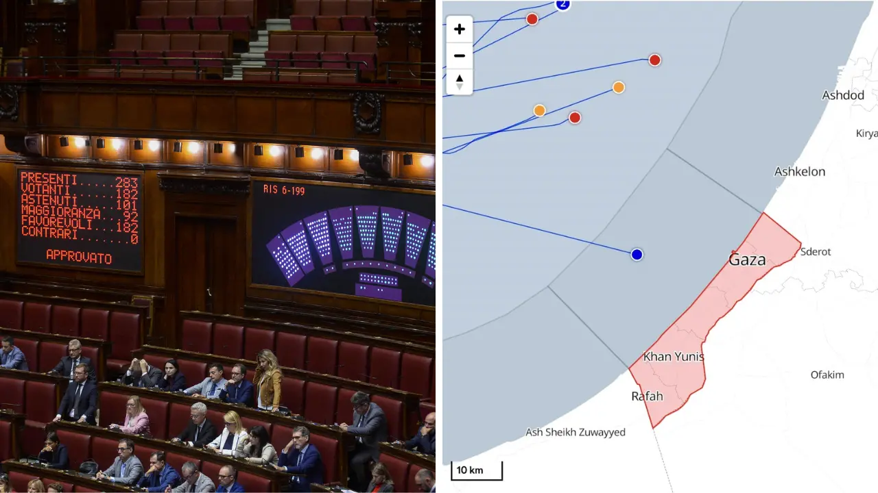 La risoluzione di Pd-M5s-Avs impegna invece il governo «a riconoscere la Palestina quale Stato democratico e sovrano entro i confini del 1967 e con Gerusalemme quale capitale condivisa, che conviva in pace, sicurezza e prosperità accanto allo Stato di Israele», «a sostenere», «a partire dal negoziato che si è aperto intorno alla proposta di tregua avanzata dagli Usa, ogni iniziativa volta a esigere un immediato cessate il fuoco, la liberazione incondizionata degli ostaggi» e «la protezione della popolazione civile di Gaza»; «garantire piena protezione, il rispetto dei diritti e dell'incolumità degli attivisti della Global Sumud Flotilla».