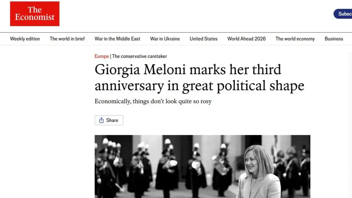 Il ritratto parte da lontano: dalla militanza nel Msi a 15 anni, dal debutto nel governo Berlusconi del 2008 come ministro della Gioventù – a 31 anni, la più giovane del dopoguerra – fino alla rottura con il centrodestra tradizionale e alla fondazione di Fratelli d’Italia nel 2012. «Dal 2014, da quando è alla guida del partito, ha trasformato una forza marginale in un movimento mainstream», scrive l’Economist. L’ascesa culmina nel 2022 con la vittoria elettorale e l’arrivo a Palazzo Chigi.