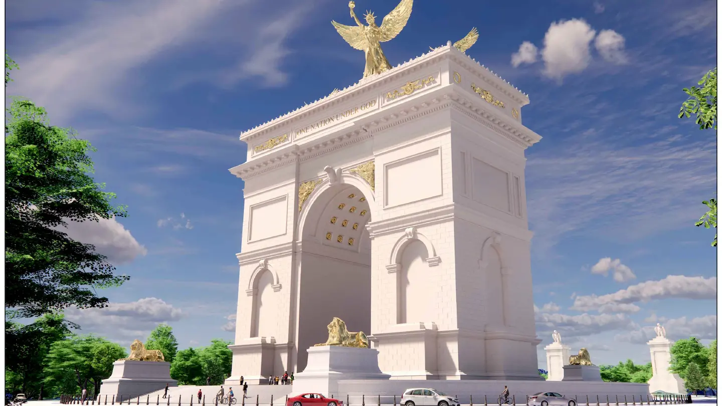 Il progetto richiama chiaramente lo stile dell’Arco di Trionfo di Parigi, elemento che ha alimentato sui social il soprannome “Arc de Trump”. L’opera, secondo le intenzioni, sarebbe sormontata da aquile e da una figura angelica dorata, con iscrizioni patriottiche come “One Nation Under God” e “Liberty and Justice for All”.