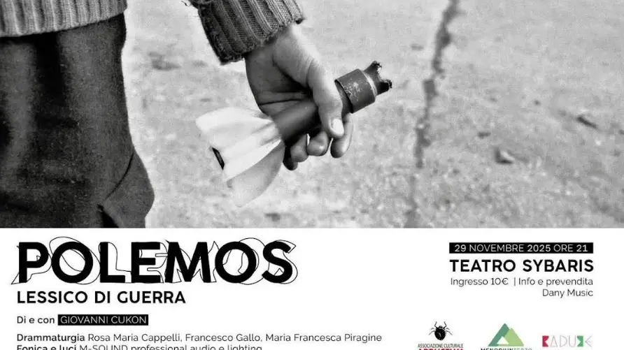 Si parte sabato 29 novembre alle ore 21.00 Teatro Sybaris - con Polemos – Lessico di guerra, spettacolo che nasce dal racconto di vita di Giovanni Cukon, che sin da bambino ha vissuto in prima persona la guerra in Jugoslavia e che, dopo essersi arruolato nell’esercito croato, è finito a lavorare come contractor in varie zone del mondo. Protagonista assoluto della scena sarà lui con i suoi fantasmi, i suoi amori e le sue sofferenze. Dopo aver fatto l’esperienza di alcuni laboratori teatrali, Giovanni Cukon ha scoperto di avere per il teatro una vera e propria vocazione, che si è rivelata nella sua intensa interpretazione di Hamm, protagonista del “Finale di Partita” di Beckett realizzato da Aprustum la primavera scorsa. Lo spettacolo è realizzato in collaborazione con l’associazione Menodiunterzo.