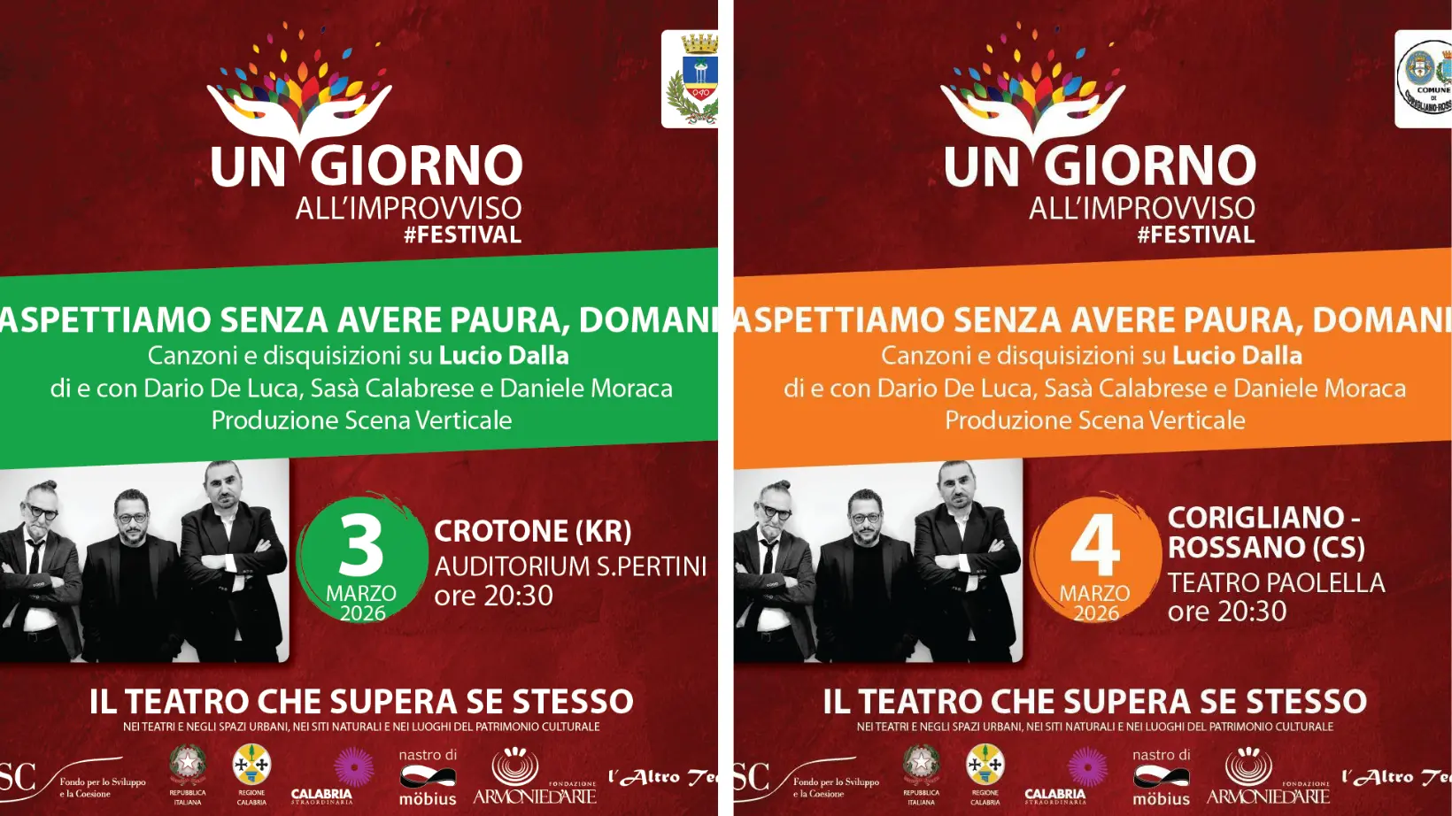 “Un giorno all’improvviso #Festival – Il Teatro che supera se stesso” rende omaggio a uno dei più grandi musicisti e cantautori della storia della musica italiana dedicando due appuntamenti a Lucio Dalla con lo spettacolo “Aspettiamo senza avere paura, domani”. Martedì 3 marzo, alle ore 20.30, all’Auditorium “S. Pertini” di Crotone e mercoledì 4 marzo, alle ore 20.30 al Teatro Paolella di Corigliano Rossano, Dario De Luca (voce narrante), Sasà Calabrese e Daniele Moraca (chitarra e voce) guideranno il pubblico in un viaggio tra brani indimenticabili, aneddoti e riflessioni legati alla vita artistica del cantautore bolognese.