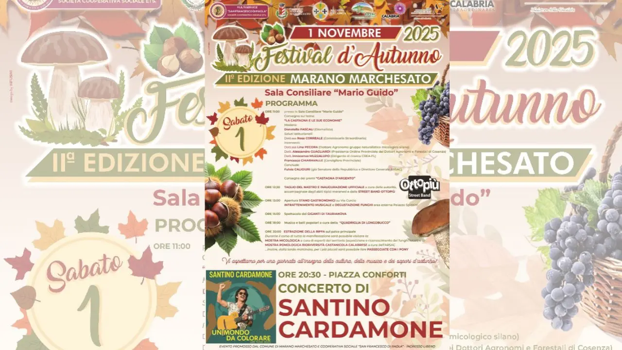 Al via sabato 1° novembre 2025 la seconda edizione del “Festival d’Autunno”, la manifestazione organizzata dal Comune di Marano Marchesato in collaborazione con la Cooperativa Sociale San Francesco di Paola e ARSAC (Azienda Regionale per lo Sviluppo dell'Agricoltura Calabrese), che offre la possibilità di trascorrere una giornata all’insegna del gusto, della tradizione e dello svago. L’appuntamento è fissato in piazza Conforti e via Curcio, con il taglio del nastro augurale a partire dalle ore 12:30 fino a sera.