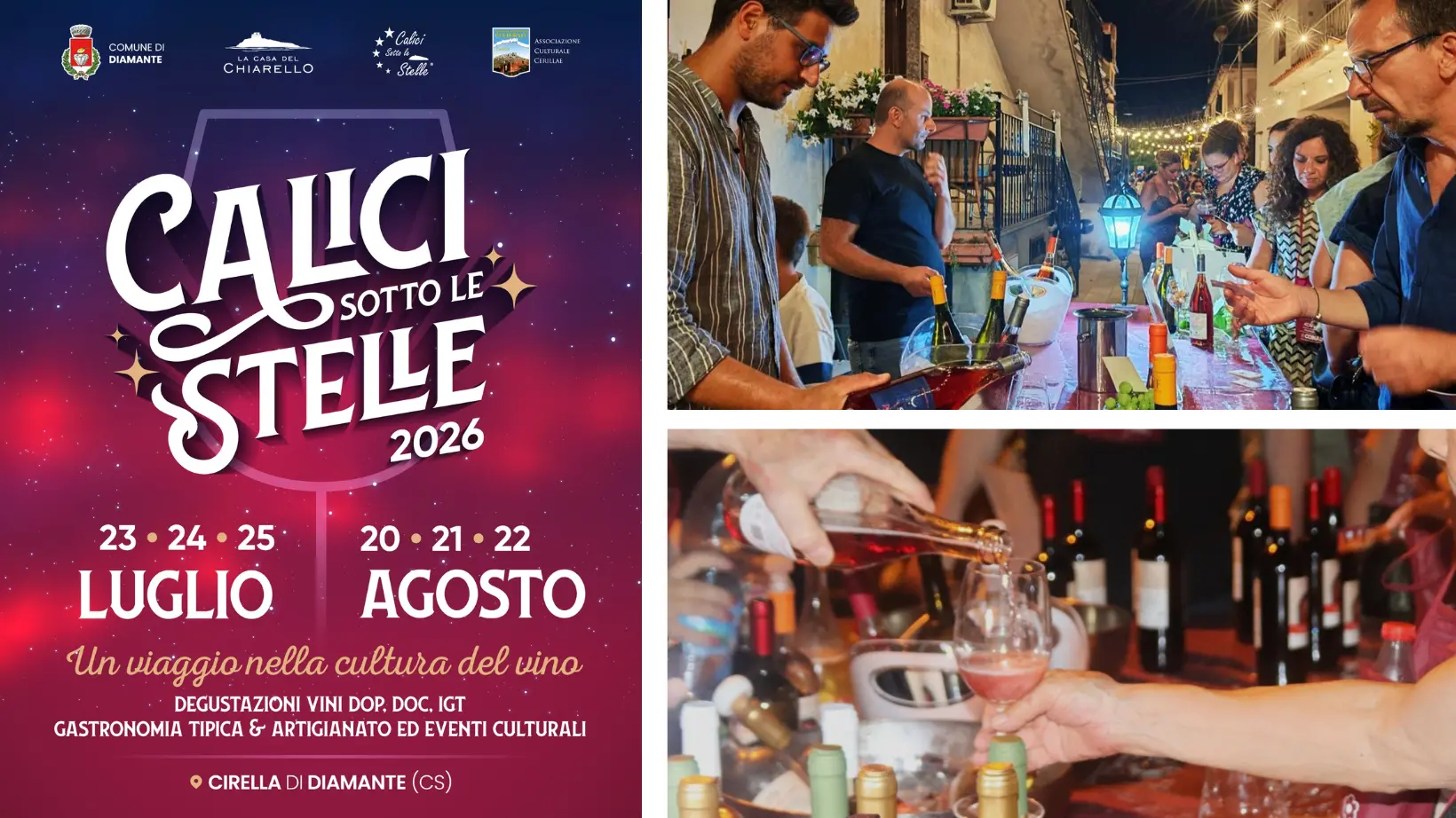 Diciassette edizioni, due appuntamenti estivi e un centro storico che ogni anno si anima di vino, musica e cultura. Torna a Cirella Calici Sotto le Stelle, in programma il 23, 24 e 25 luglio e il 20, 21 e 22 agosto 2026.