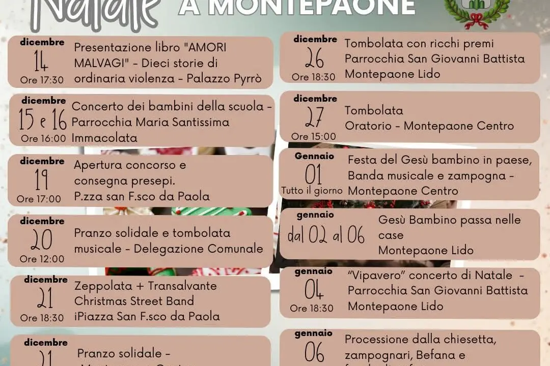 Le iniziative natalizie promosse dal Comune di Montepaone, con la collaborazione delle parrocchie ed il sostegno delle associazioni locali, si inseriscono in un più ampio percorso di valorizzazione del territorio e di attenzione al sociale, prevedendo anche momenti di aggregazione e solidarietà. In particolare, l’Amministrazione Comunale ha organizzato due pranzi di comunità dedicati alle persone sole, agli anziani e alle fasce più deboli della popolazione, che si terranno il 20 dicembre a Montepaone Lido ed il 21 dicembre a Montepaone Centro, con l’obiettivo di rafforzare il senso di vicinanza, inclusione e comunità nel periodo natalizio.