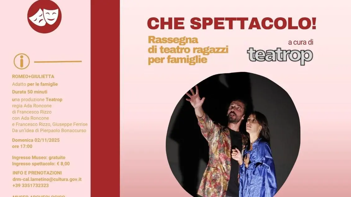 Torna l’appuntamento teatrale di “Domenica al Museo” con lo spettacolo “Romeo + Giulietta. Esercizi di stile”, di Francesco Rizzo con Ada Roncone, diretto da Pierpaolo Bonaccurso, attore e regista di Teatrop. La pièce è in programma alle 17 di domenica 2 novembre 2025 nelle antiche sale del Museo Archeologico Lametino.