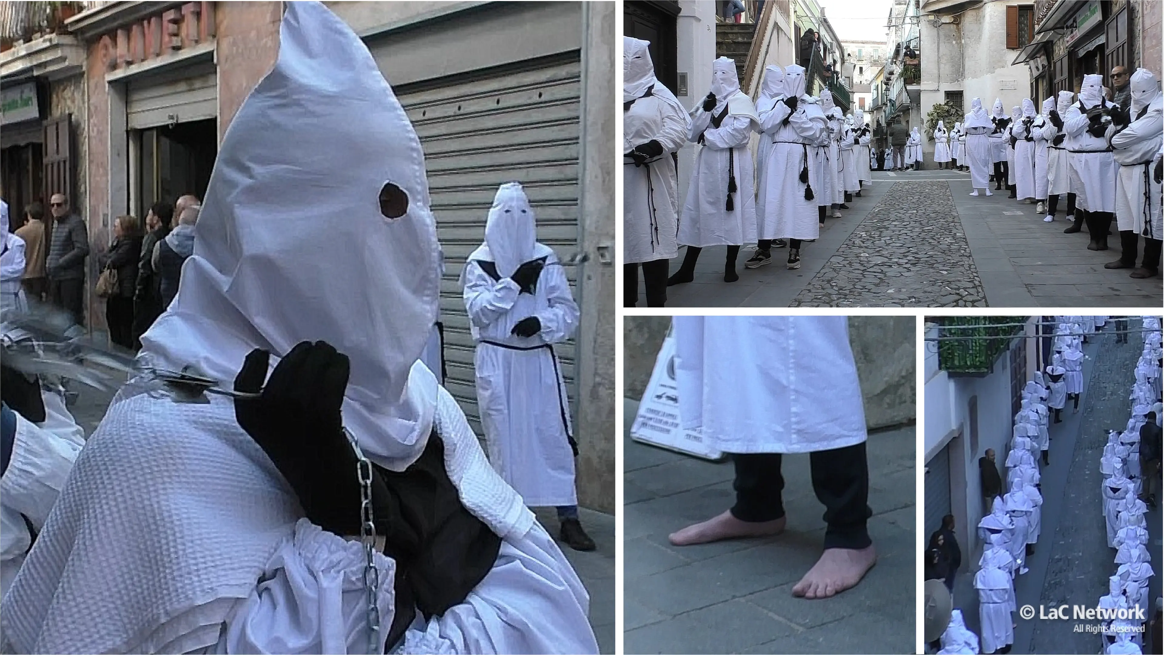 Prima ancora che la processione si metta in moto, in qualche locale attiguo alla Cattedrale (negli ultimi anni nel Succorpo), si compie “la vestizione”, un rito intimo e silenzioso. Uno per uno, gli uomini e le donne che hanno fatto voto indossano la tunica bianca aiutandosi a vicenda. Poi calano il cappuccio, in dialetto “u ciddizz”, che copre interamente il volto. Da quel momento in poi, non sono più riconoscibili. Scelgono di non esserlo, l'anonimato è parte essenziale del voto. Chi si flagella lo fa nella sfera più privata della propria coscienza, senza voler essere riconosciuto, senza cercare ammirazione. Il cappuccio bianco è una forma di umiltà radicale, si porta il peso davanti a Dio, non davanti agli uomini. Eppure, paradossalmente, la loro presenza è tra le più visibili dell'intera giornata.