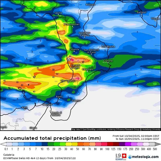 Secondo gli ultimissimi aggiornamenti meteorologici sono previsti, tra le ore 12:00 e le ore 24:00 possibili picchi fino ai 70-80 mm sui settori tirrenici del Cosentino, Lametino (che dovrebbe essere la zona più colpita dal maltempo) e Vibonese e relative aree interne; da notare come anche il Catanzarese Jonico è in pole per ricevere quantitativi abbondanti. Altrove invece gli accumuli saranno compresi tra i 10 mm e i 20 mm.