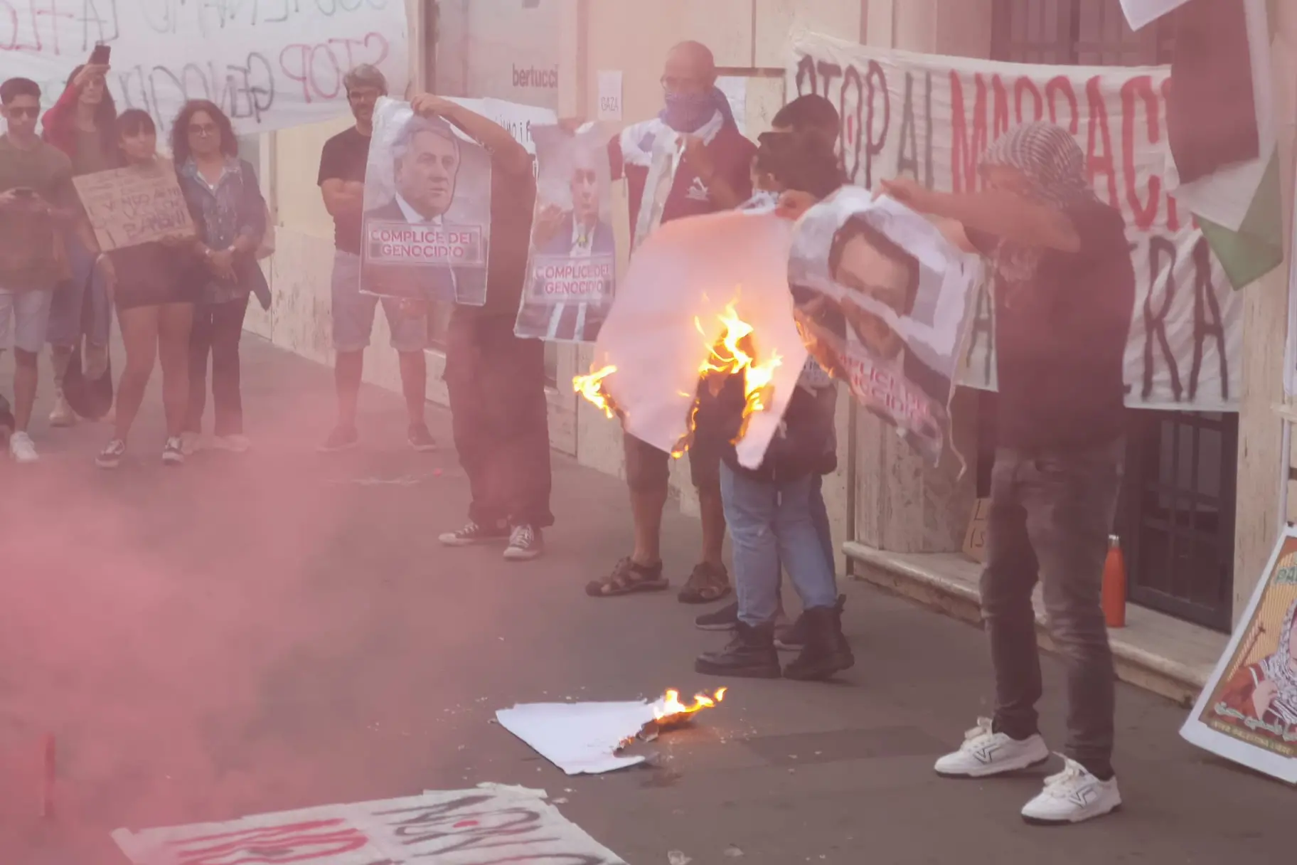 La piazza della protesta chiaramente non ama il governo Meloni e le posizioni tiepide e tardive prese sull’eccidio del popolo palestinese. «Bruciano le case, massacrano i bambini. Giorgia Meloni, governo d’assassini», gridano i manifestanti. Il presidio pro-Palestina resiste fino alla fine del comizio pro-Occhiuto: alcuni danno fuoco all’effigie della premier e di altri membri della maggioranza di governo. «Bruciamo le loro facce perché non ci rappresentano», dice uno dei manifestanti al megafono. Inceneriti i volti di Meloni, del presidente della Commissione europea Ursula von der Leyen, degli esponenti del governo italiano. Volano in cenere davanti a fagotti imbrattati di rosso, simbolo dei 20mila bambini palestinesi uccisi.