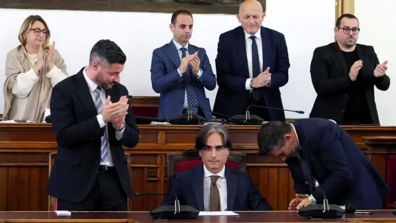 Il sindaco si rivolge alla minoranza: «Al netto delle differenze politiche e degli obiettivi futuri, c’è qualcosa che ci accomuna: l’amore per la città». Il saluto del primo cittadino finisce tra gli applausi del Consiglio: tutti in piedi... tranne i consiglieri del Pd