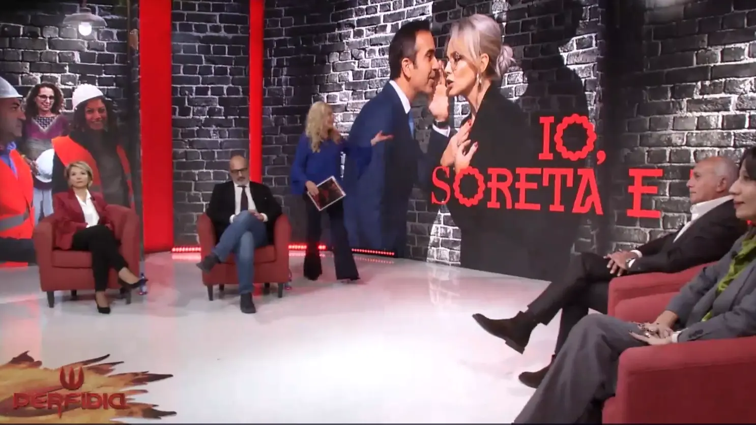 Si torna a questo punto al tema cardine della puntata: "Io, soreta e tu", con la locandina iconografica di Samuele Vallone, che sintetizza le fibrillazioni: Salvini e Meloni appartati; Occhiuto che conversa con Marina Berlusconi; Tajani defilato, forse inquieto.