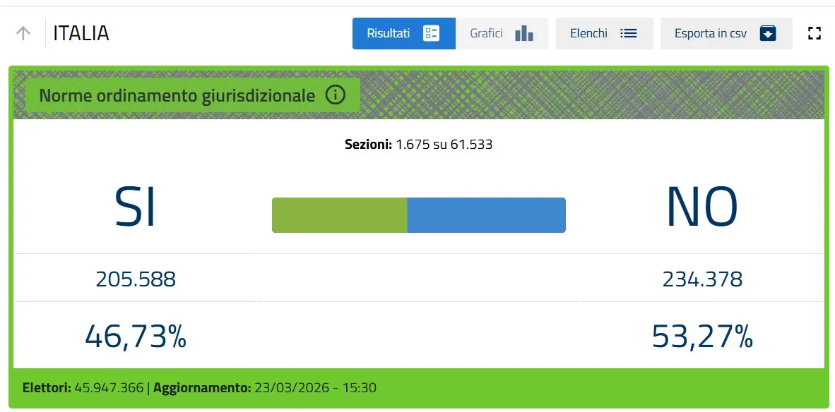 No al 53,27%, Sì al 46,73% quando le sezioni scrutinate sono più di 1600 su 61mila. Il dato è statisticamente non ancora significativo, per avere un dato più solido si dovrà aspettare almeno un terzo delle sezioni totali scrutinate.