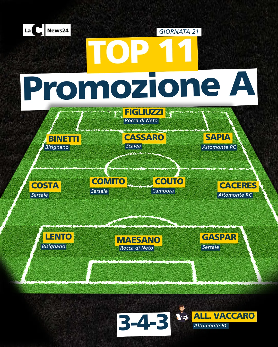 Anche la ventunesima giornata del campionato di Promozione A è andata in archivio e, come di consueto, la redazione sportiva di LaC News24 ha stilato la Top11 settimanale.